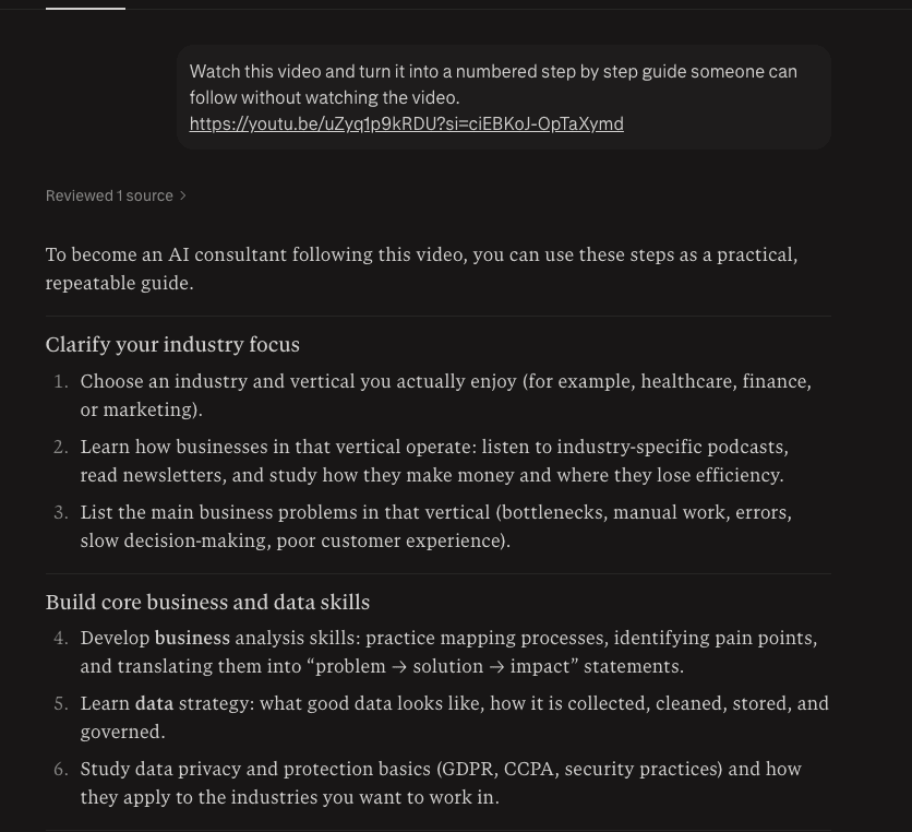 Pull numbered steps, recipes, or checklists from YouTube and recordings so no one has to scrub through the video.